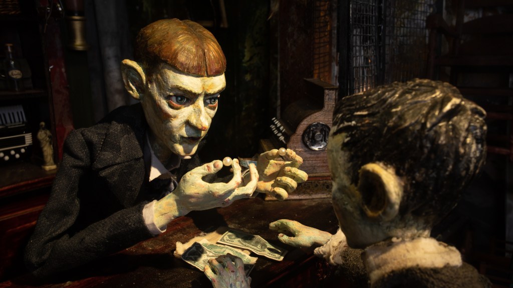 Visually, the film is rich and tactile, with an artisanal quality that feels deliberately handmade. Textures and shadows give the imagery a storybook gravity, while the muted palette reinforces the sense of melancholy that hangs over every frame. The animation style invites close attention, drawing the viewer into a world that feels both timeless and unsettlingly familiar.